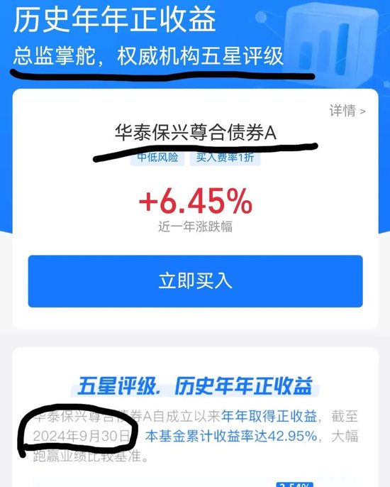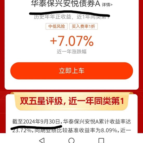 回到首页,其它重要的广告位,诸如宣传词为“聚焦利率债近一年同类第1”的华泰保兴安悦债券A,业绩数据截至于2024年9月30日。